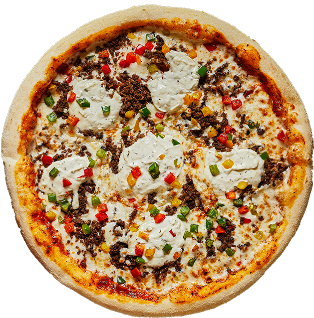 Sauce am?ricain & tomate, mozzarella, viande hachée, Boursin, poivrons