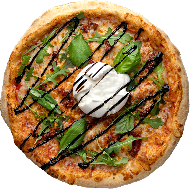 Mozzarella, tomates marinées, roquette, boule de burrata, vinaigre balsamique